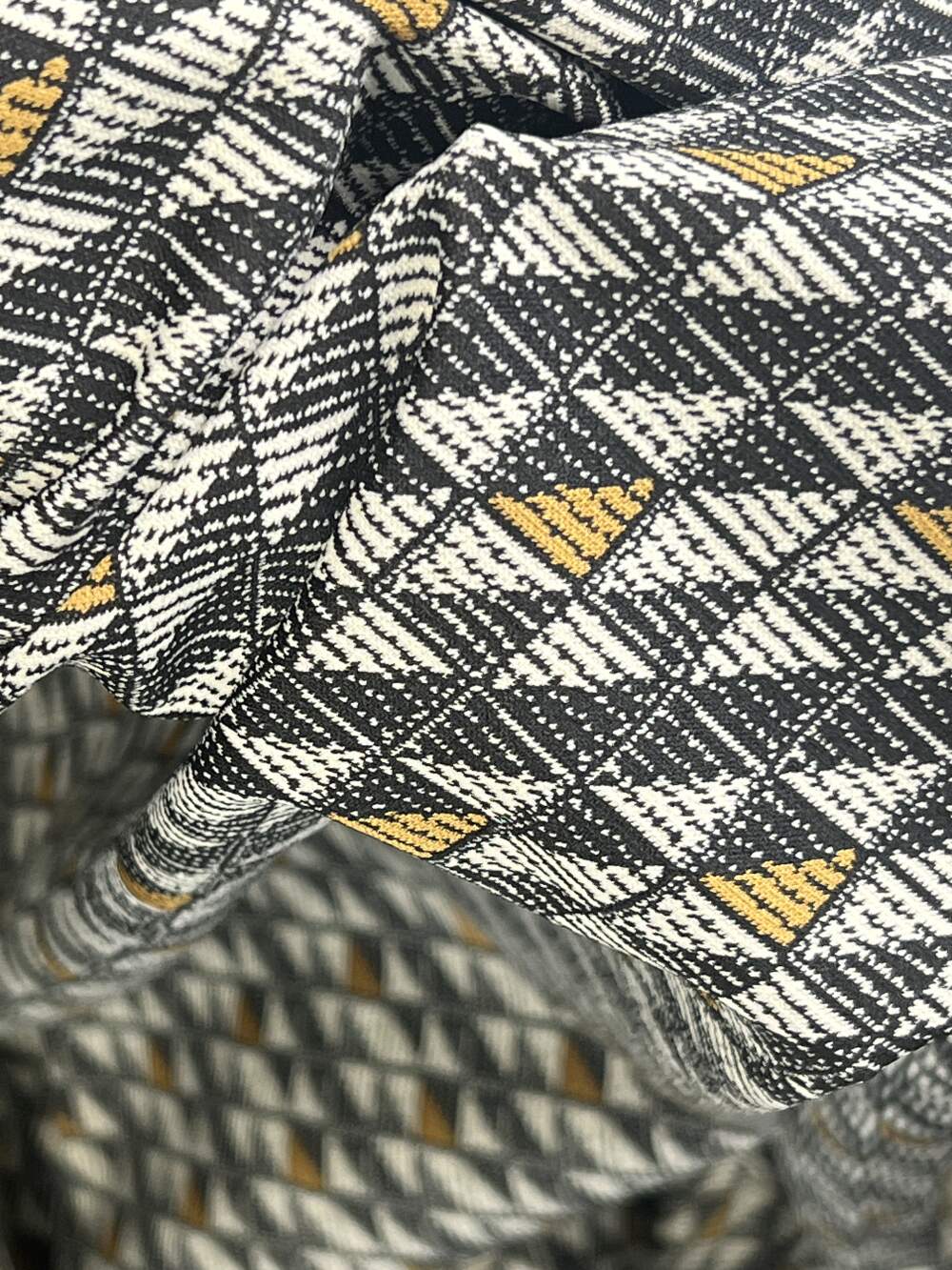 Jacquard in misto poliestere caratterizzato da un elegante motivo a piccoli rombi, sviluppato in una palette dinamica di giallo, bianco e nero.