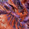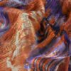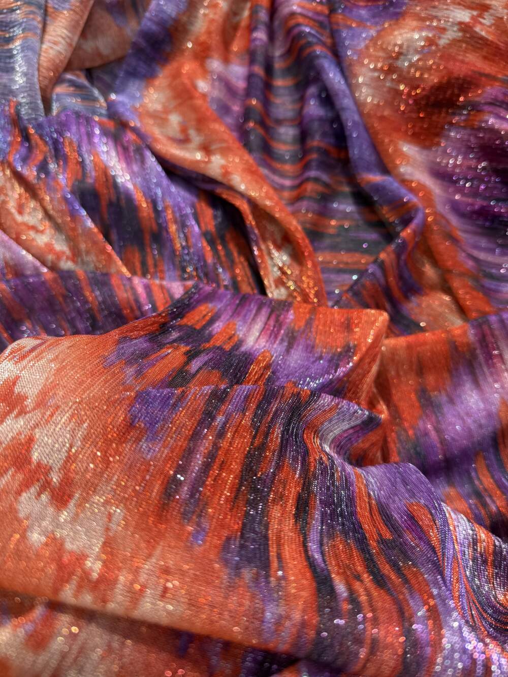 La sua trasparenza delicata e i bagliori del lurex aggiungono un tocco di sensualità ed eleganza, mentre la fantasia dai toni vibranti di arancio, rame e viola ricrea un effetto pittorico ispirato ai tramonti infuocati.