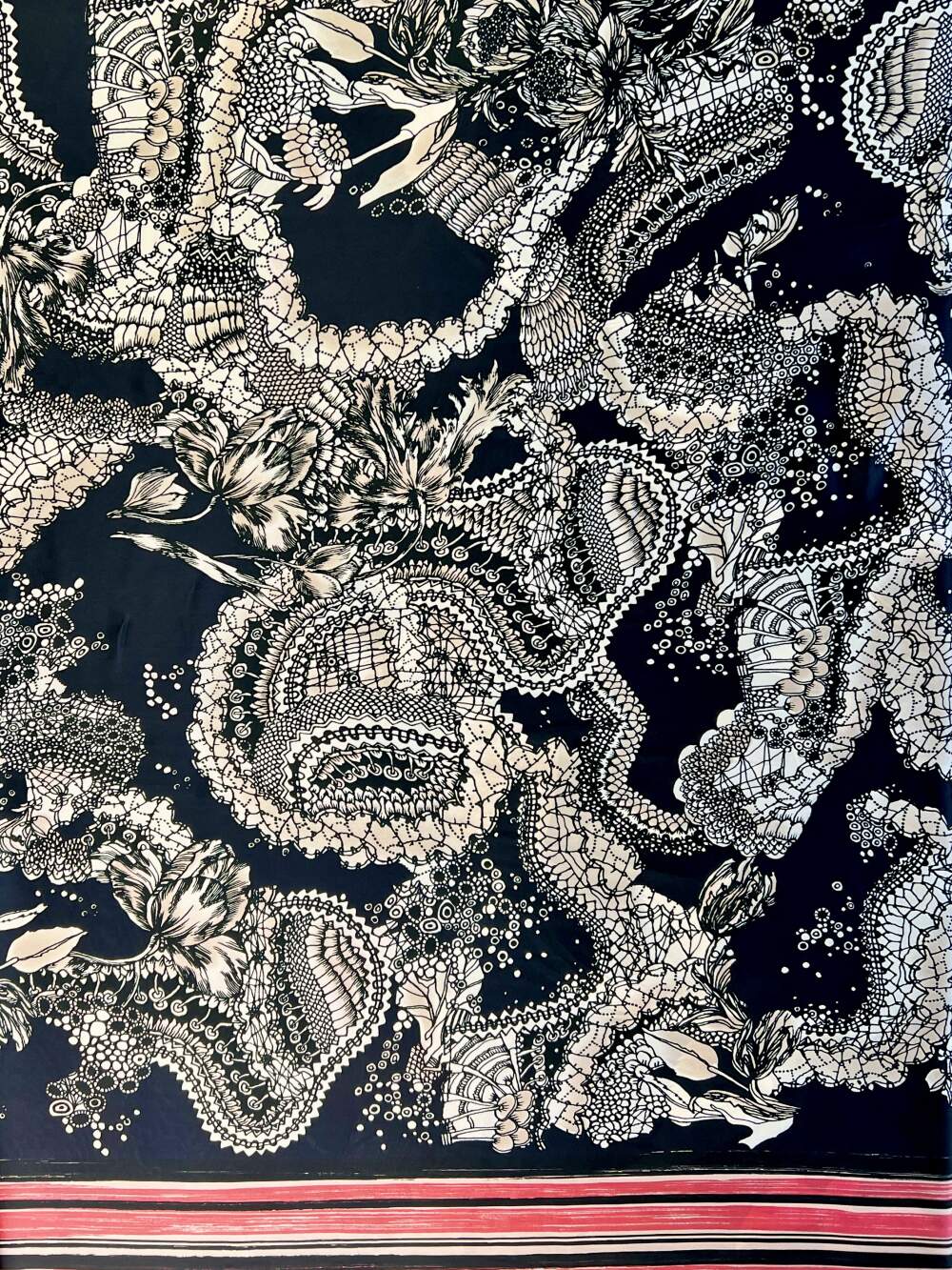 Raso di poliestere stampato con una balza bilaterale nei colori bianco, beige e rosso su fondo nero.