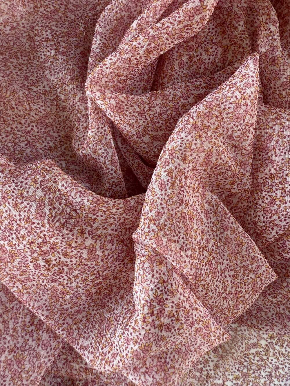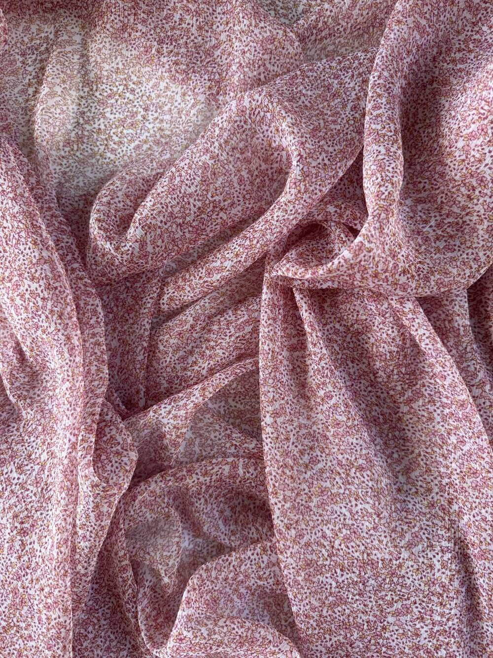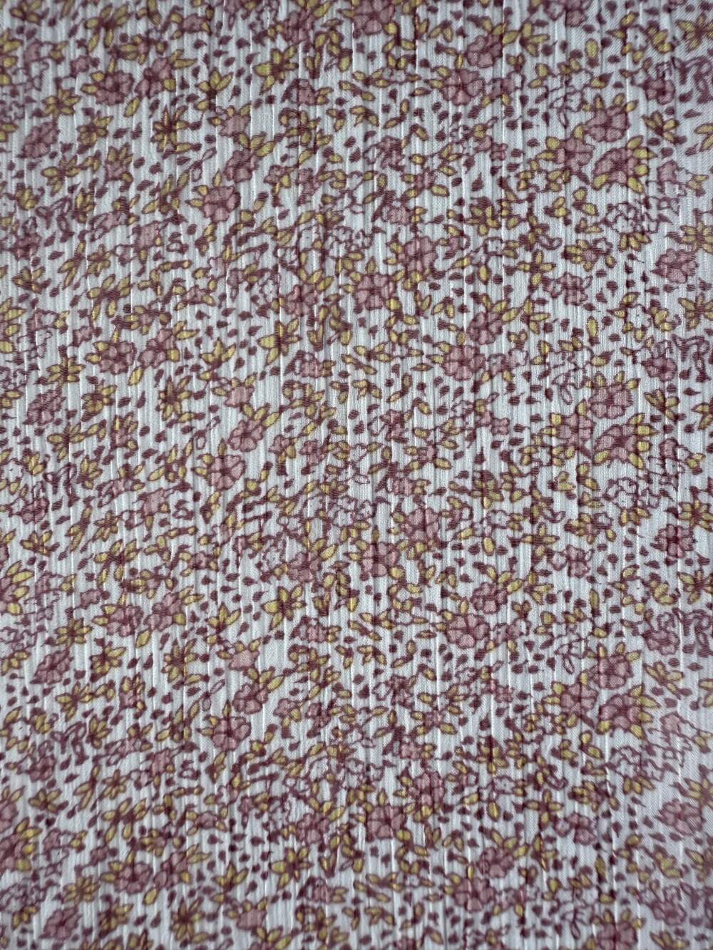 Creponne di poliestere con una delicata stampa a fiorellini piccoli nei toni del rosa.