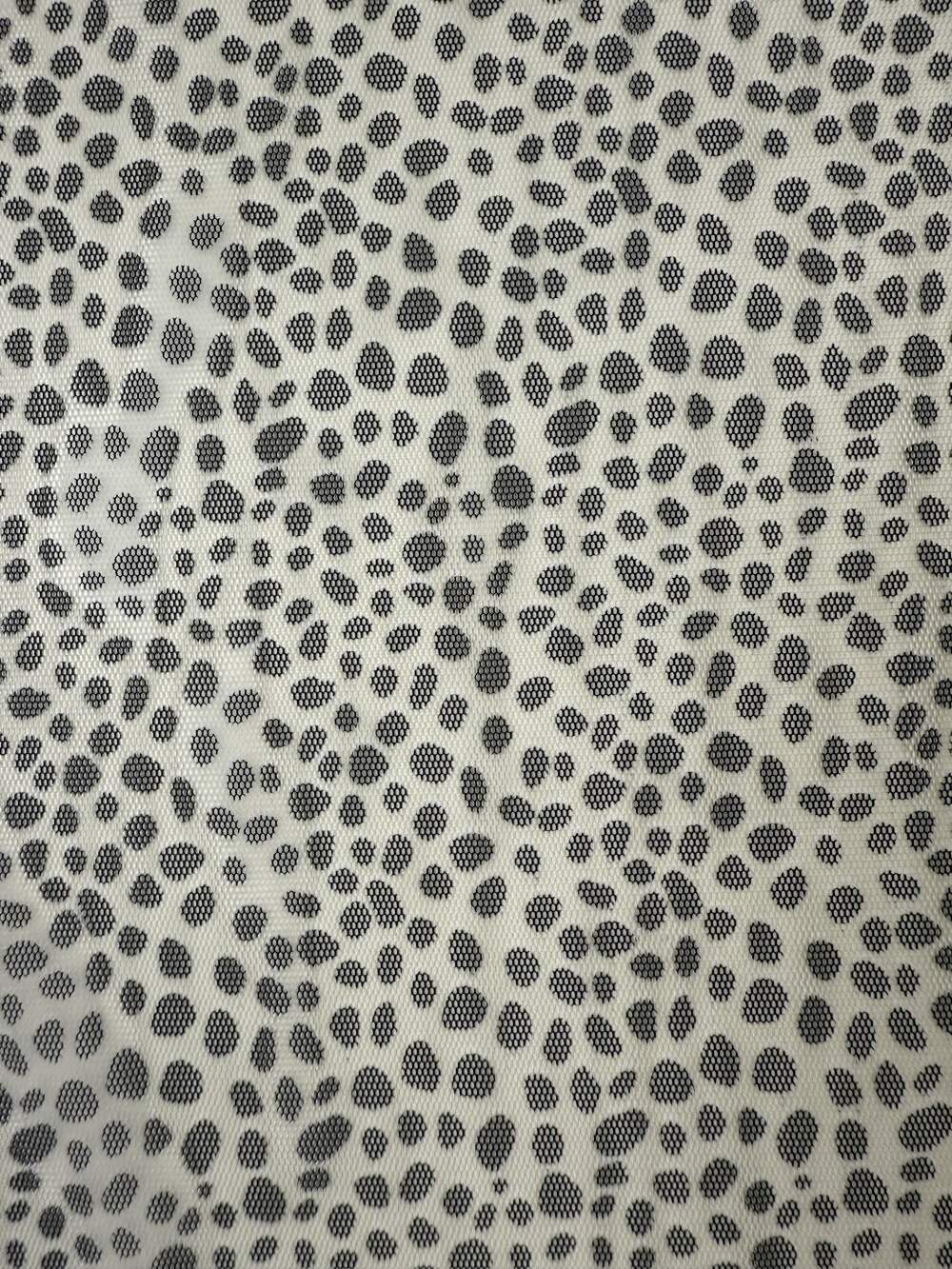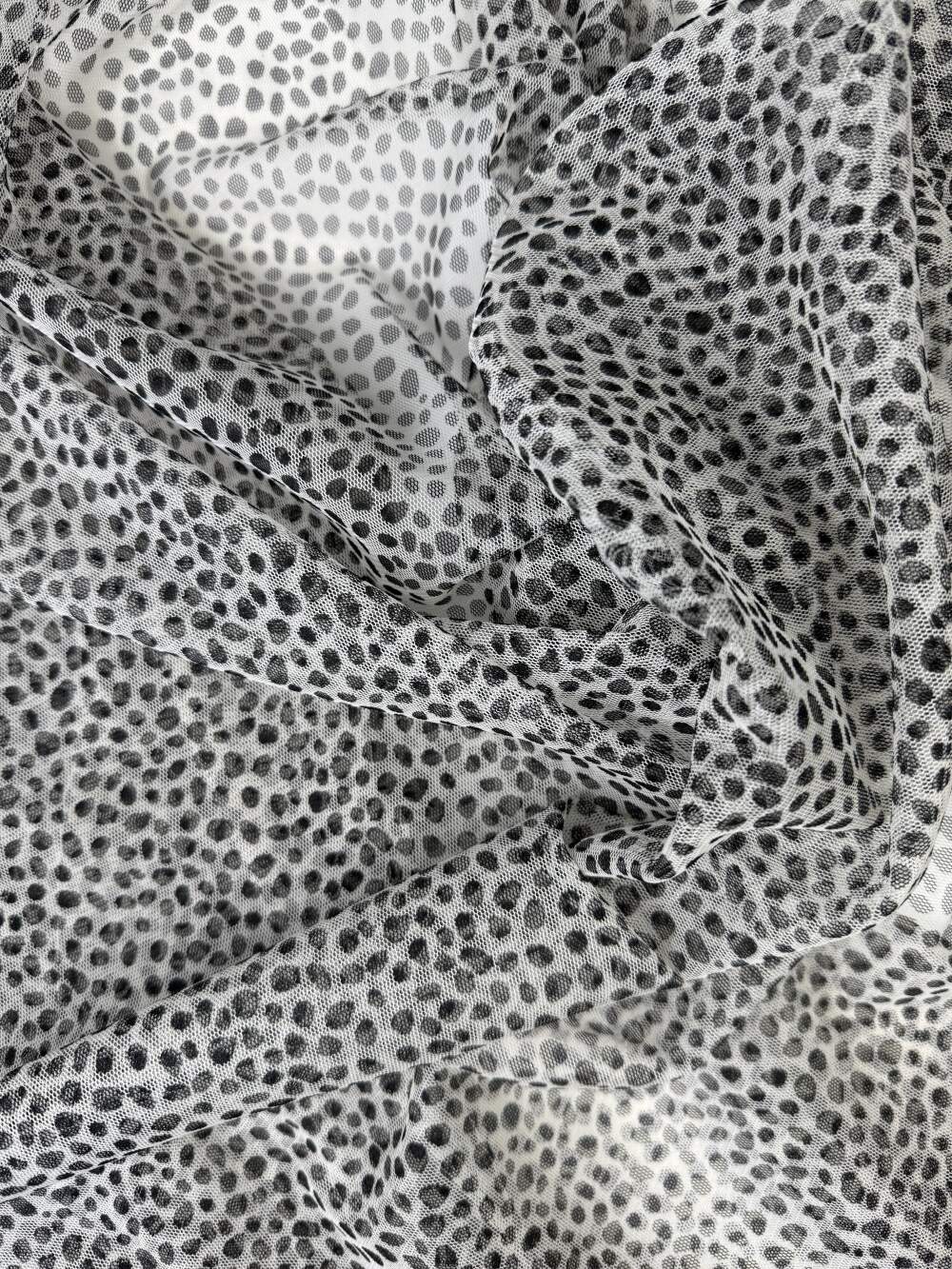 Raffinato tulle maculato ‘dalmata’ in poliestere con trama leggera e trasparente.