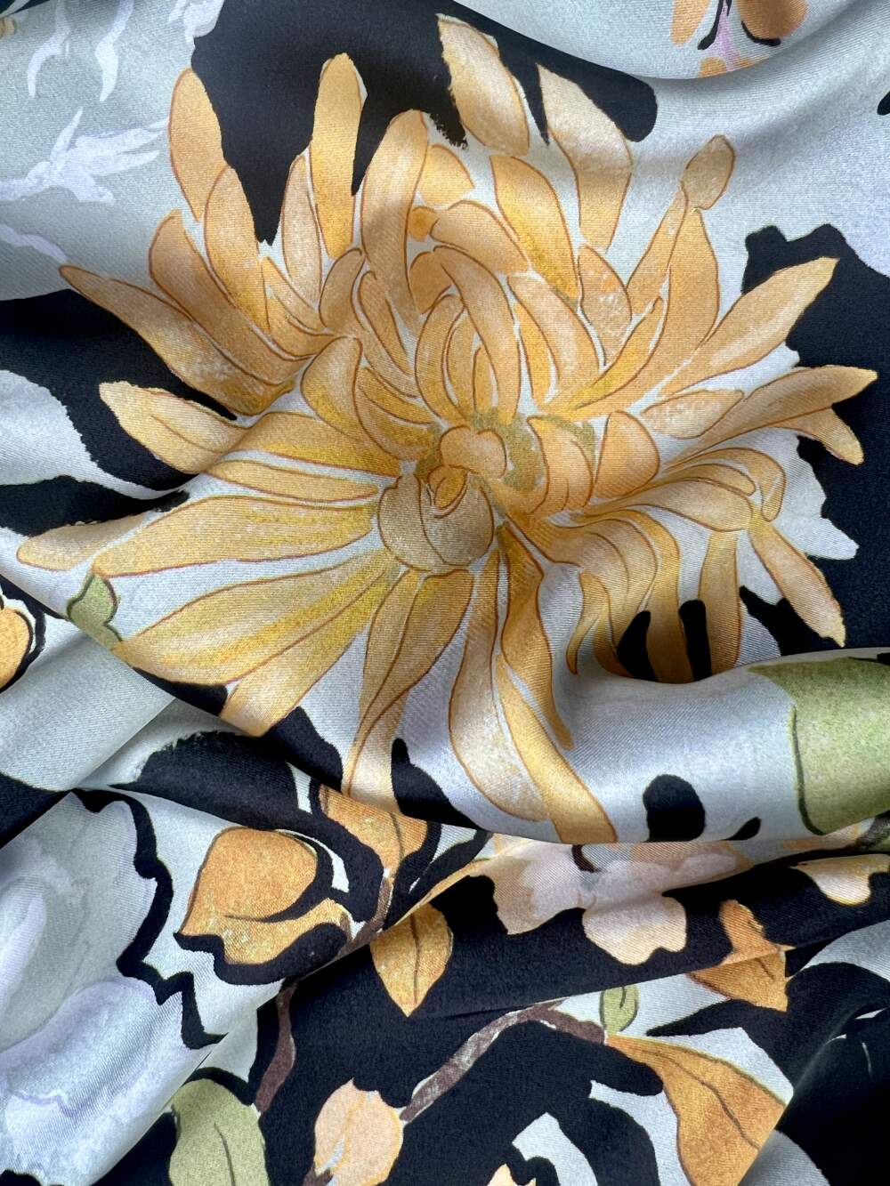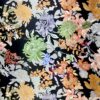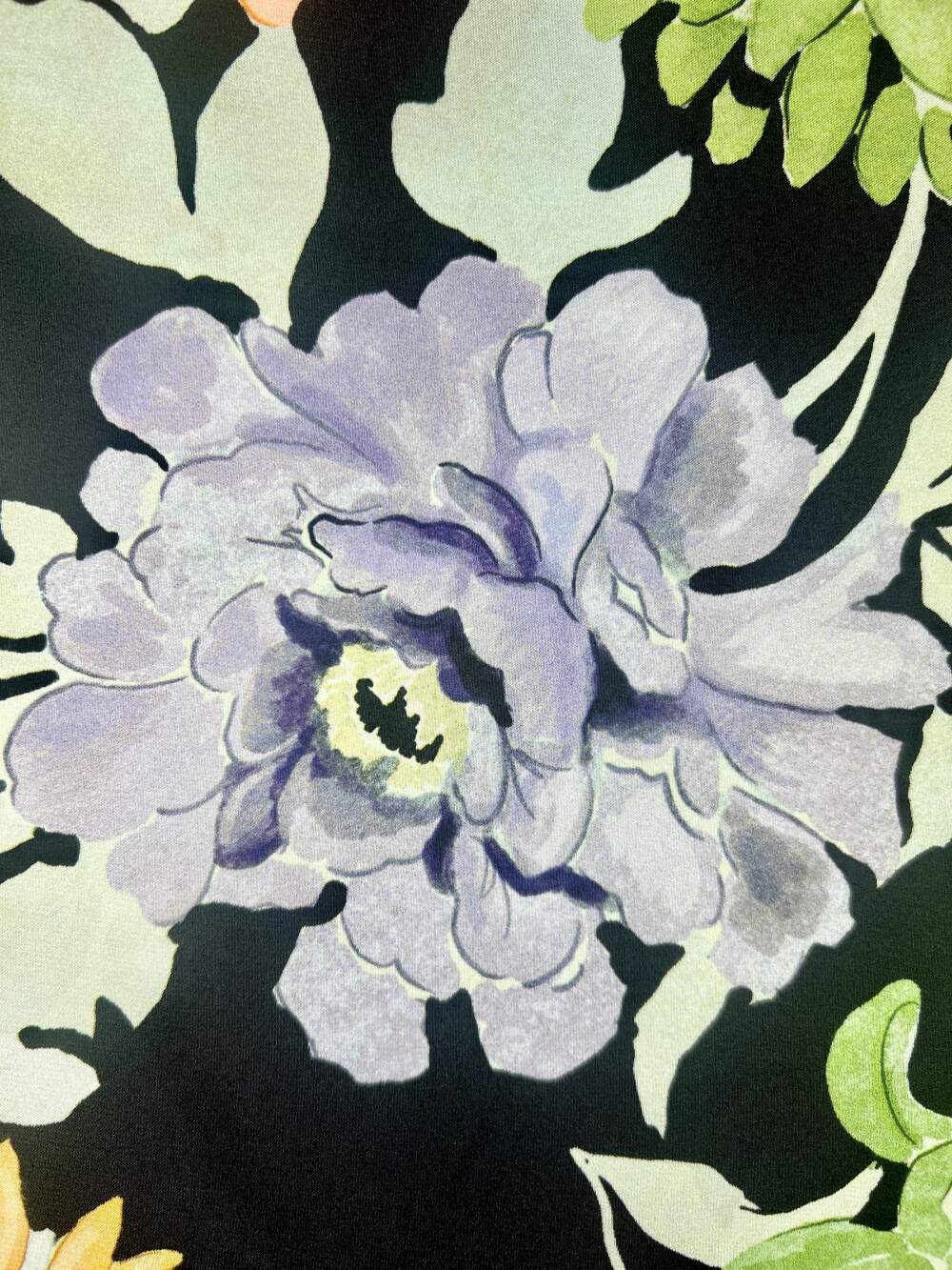 Satin di poliestere stampato con motivo floreale di colore pastello su fondo nero. Questa stampa dona al tessuto un carattere romantico ed allo stesso tempo deciso grazie al contrasto tra i colori tenui e lo sfondo nero.