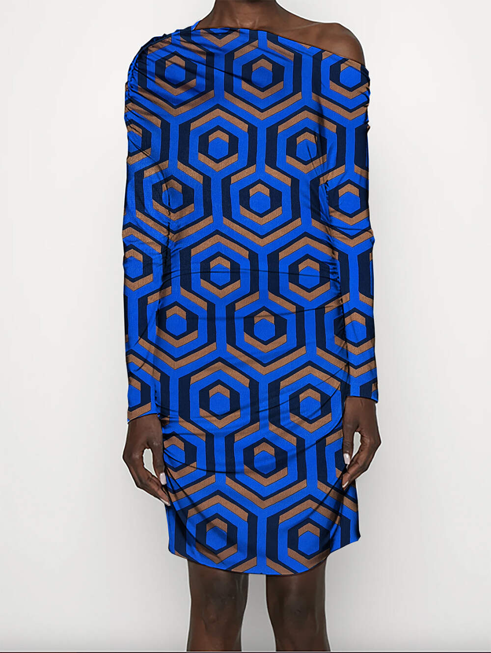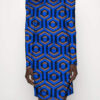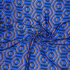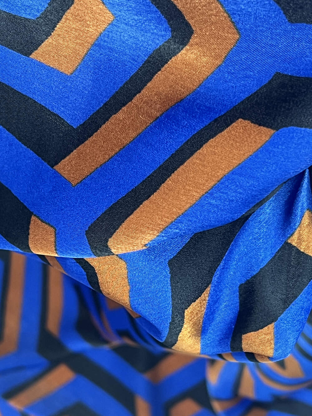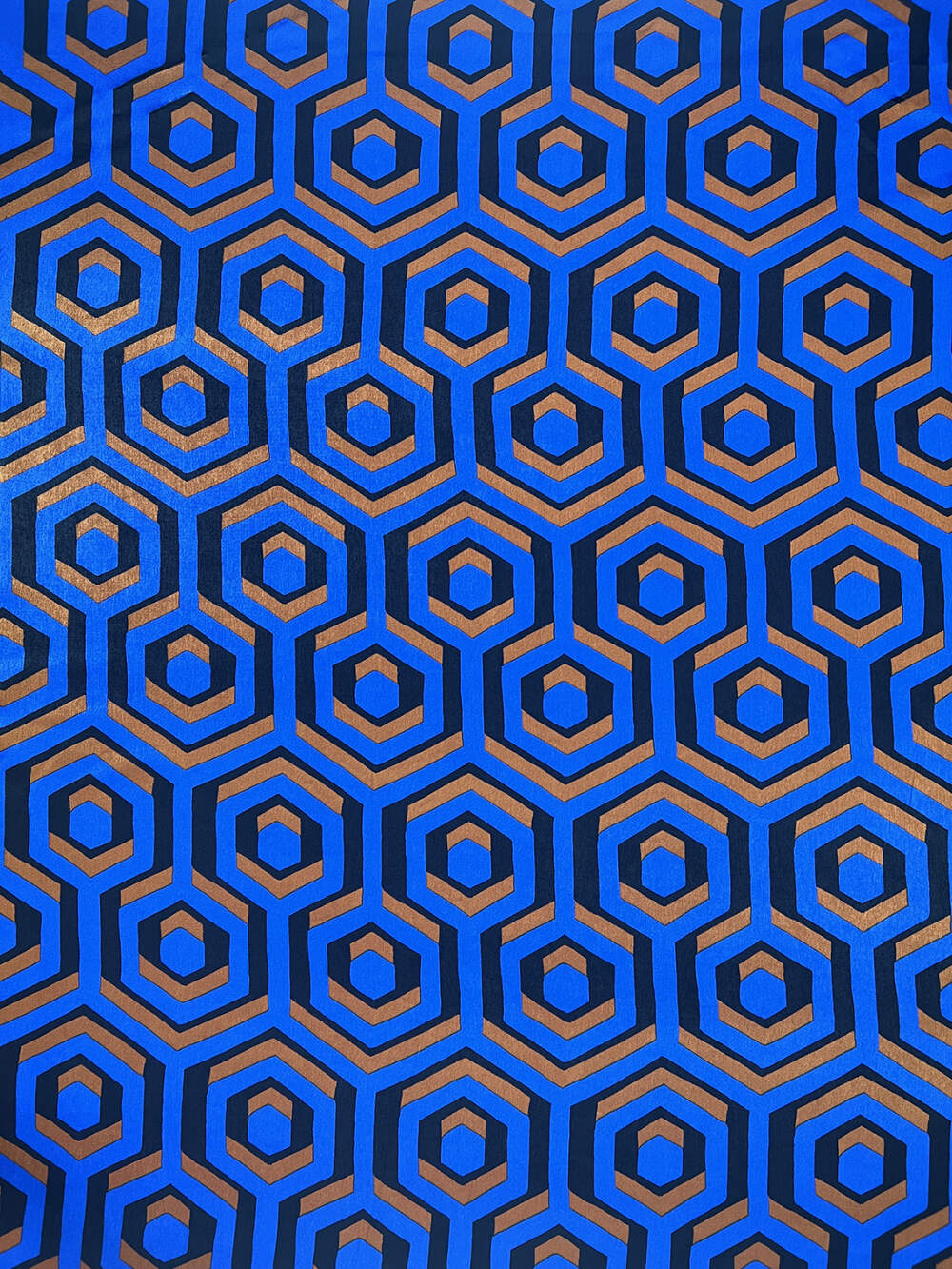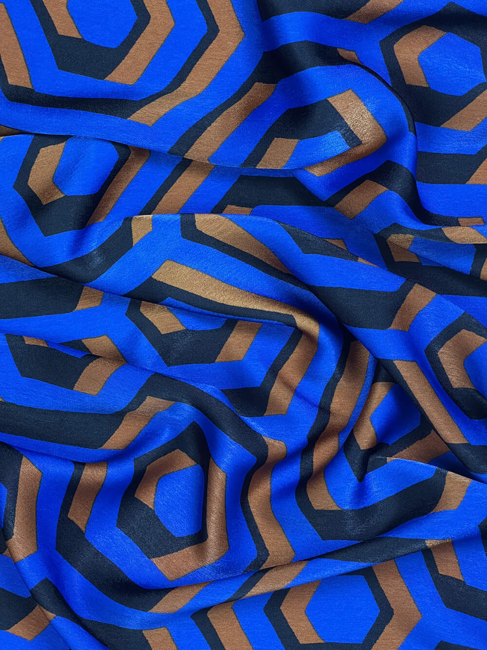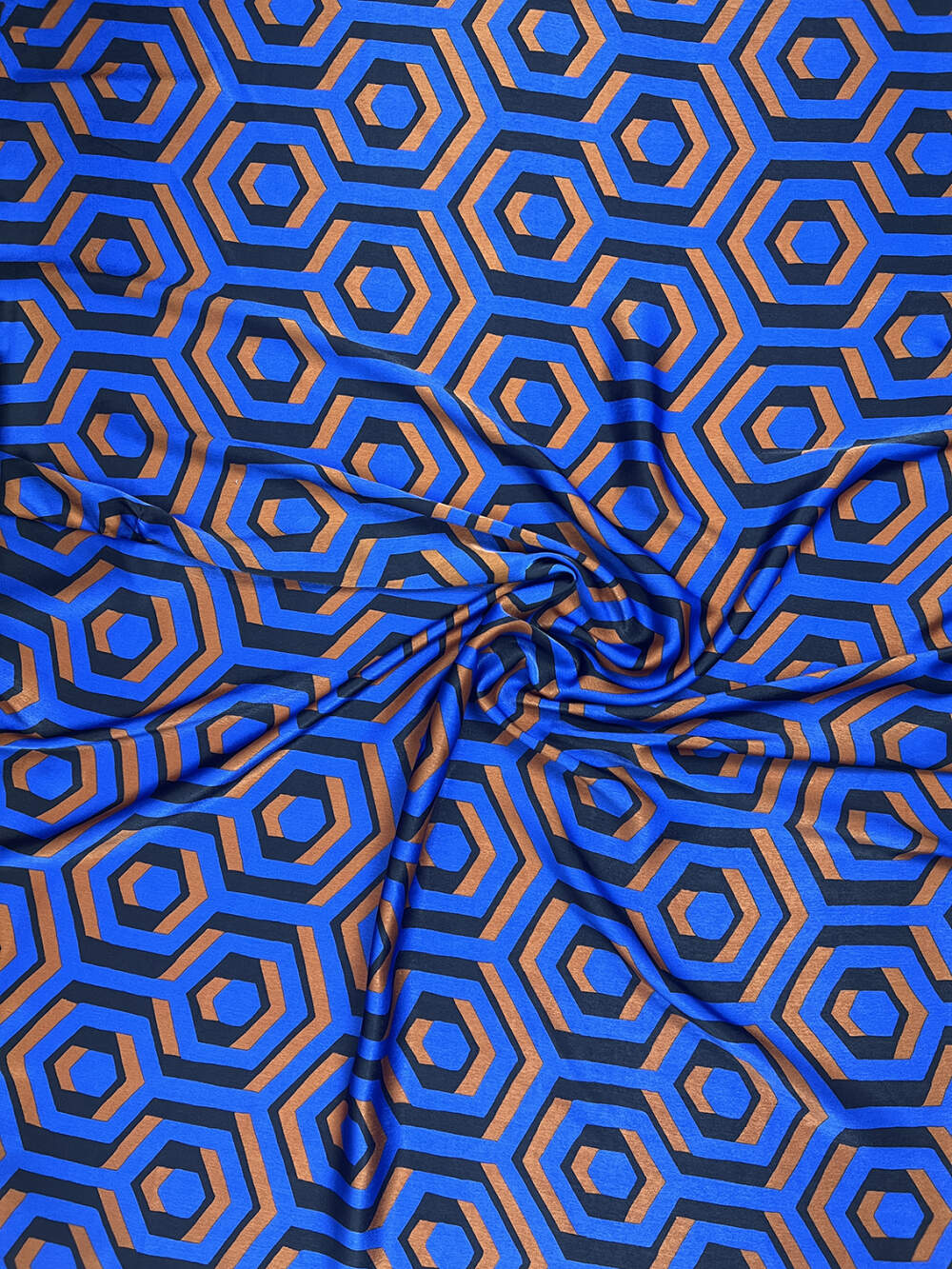 Lasciati sedurre dalla morbidezza irresistibile di questo raso vellutato di poliestere, caratterizzato da una mano setosa e un riflesso luminoso che esalta ogni movimento. La magnetica stampa geometrica a esagoni intreccia tonalità marrone cammello e nero su un vibrante fondo bluette, creando un effetto tridimensionale di grande impatto visivo.