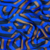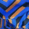 Raso vellutato di poliestere con stampa geometrica nei colori marrone cammello e nero su fondo bluette.