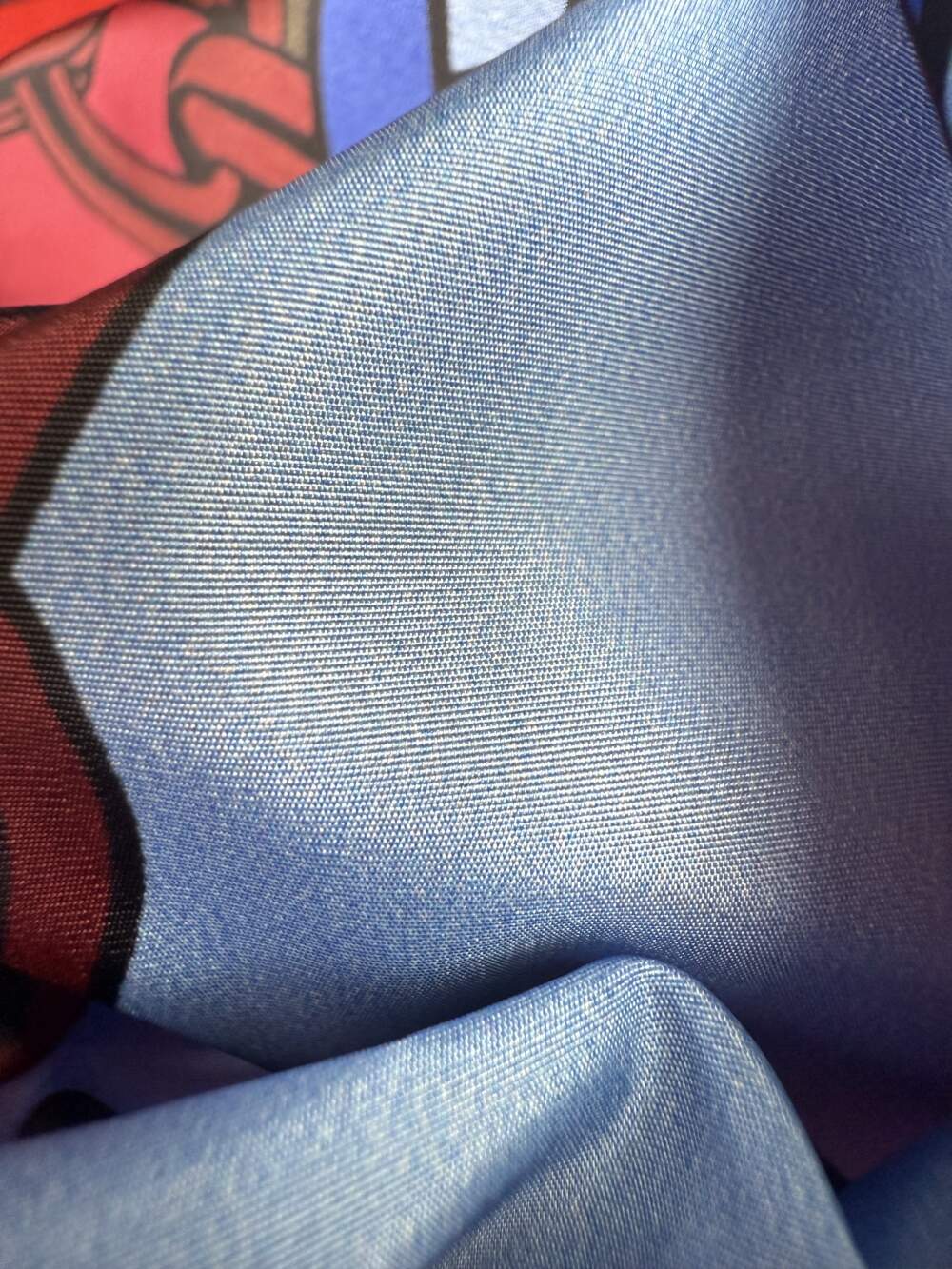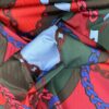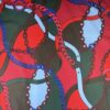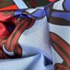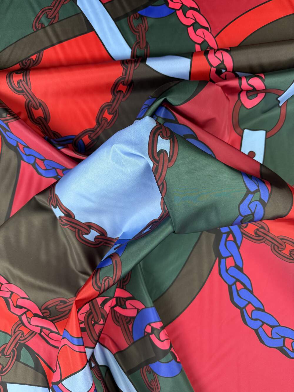 I colori vivaci, come il rosso intenso, il blu elettrico e il verde profondo, creano un contrasto dinamico e moderno. Il tessuto è leggero, strutturato e impermeabile. Ha una consistenza simile alla plastica che gli conferisce una certa rigidità. La combinazione di colori, il motivo a catene e la texture leggermente rigida danno un tocco di grinta e originalità che lo rendono ideale per capi d’abbigliamento che vogliono distinguersi.