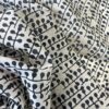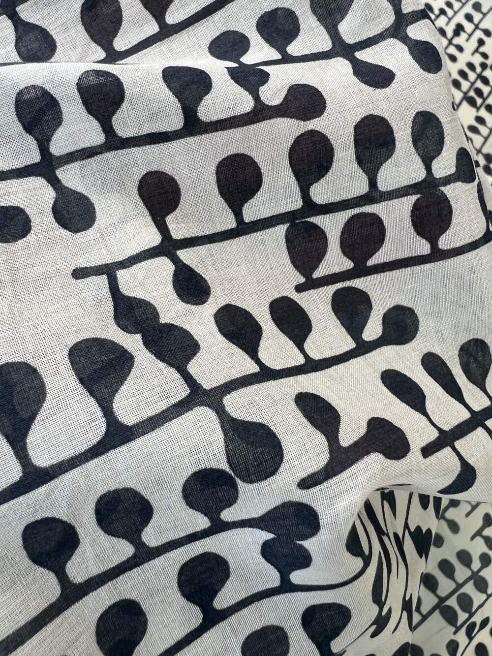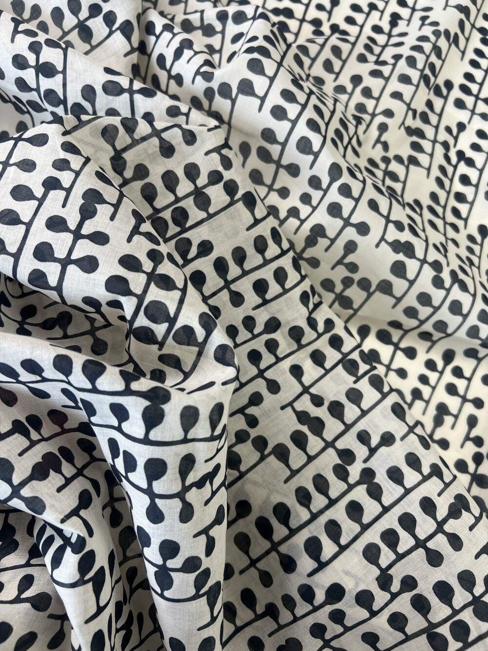 Tessuto in mussola di cotone puro con motivo botanico stilizzato.